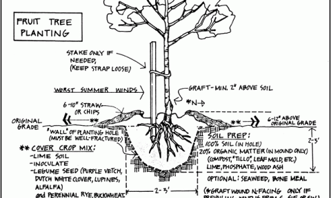Robert Kourik has an excellent article on planting fruit trees. With his technique, you build the mound as you plant, offsetting the need to dig a hole. Stake the tree only if needed, on the side of the worst summer winds. Position graft knob facing north (to protect the graft with the tree’s shade).