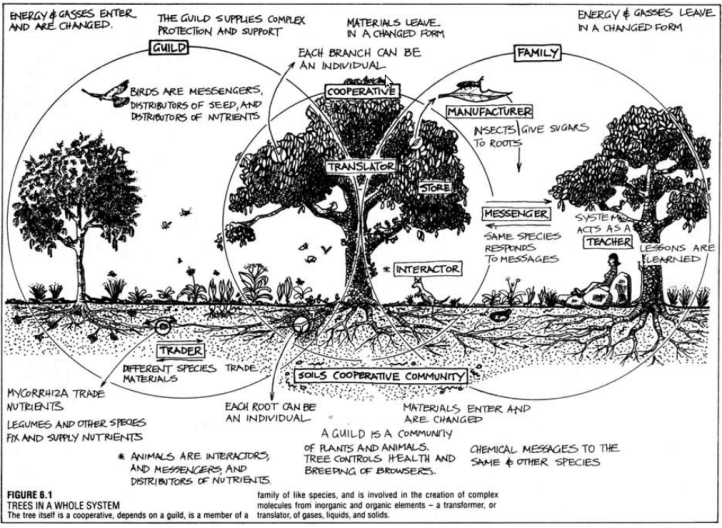 We ourselves are part of a guild of species that lie within and without our bodies. Aboriginal peoples and the Ayurvedic practitioners of ancient India have names for such guilds, or beings made up (as we are) of two or more species forming one organism. Most of nature is composed of groups of species working interdependently.Bill Mollison, Permaculture: A Designers’ Manual