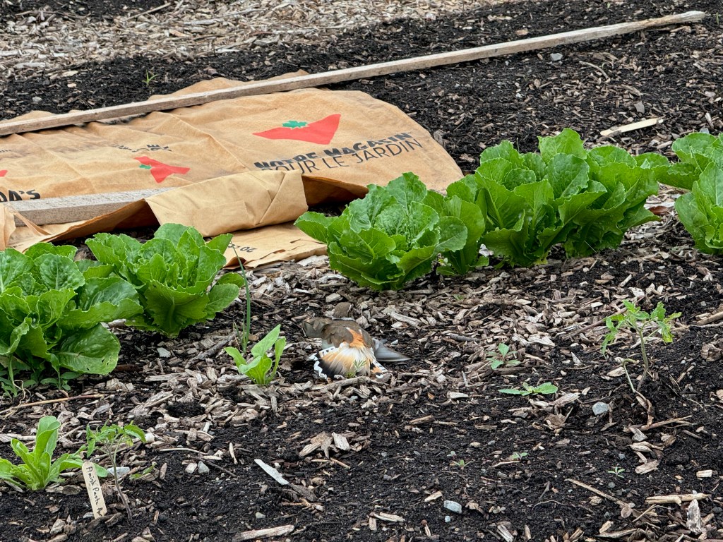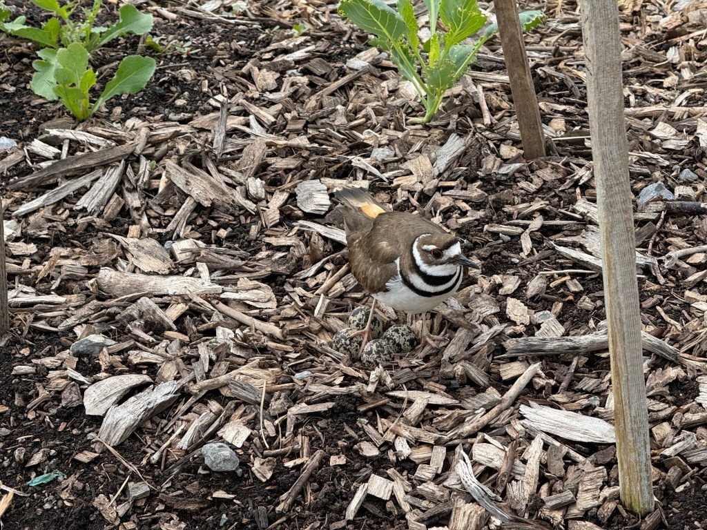 It usually takes us a while to locate the nests as the birds (and the eggs) are well camouflaged. Sometimes they nest in the middle of a wood chip path. Often they nest in plots. In 2023, well before planting, a pair nested between these boards. To make a nest, the male simply scrapes the ground to make a slight depression. The female then lays her eggs.