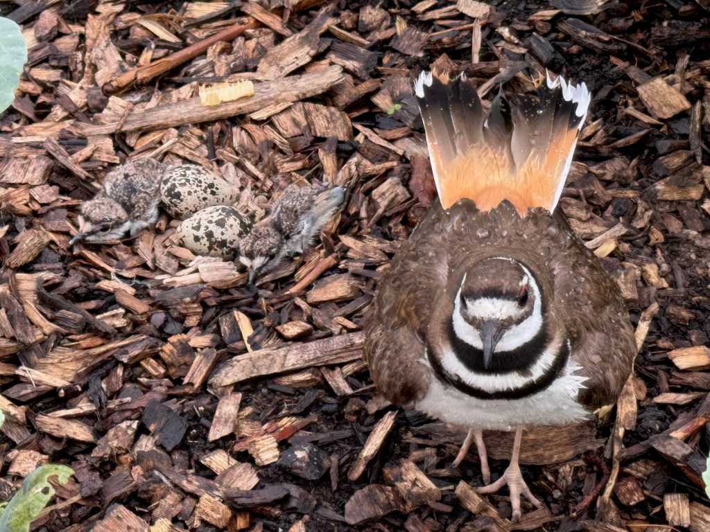 In 2024, we had several pairs attempt to nest, though only the pair in the Marian Donation Garden succeeded. Look closely and you’ll see two newly hatched chicks but no eggshells as the parents immediately remove the eggshells to help protect newly-hatched chicks from predators. The following day, these chicks had already left the nest. Since these chicks hatched on June 22, it may have been a second attempt.