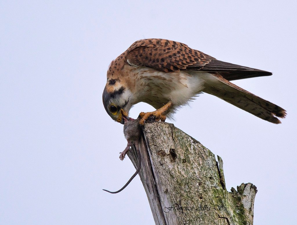 Kestrels hunt during the day, consuming primarily invertebrates (grasshoppers, cicadas, beetles, dragonflies, butterflies, moths and spiders) as well as Voles, Mice, Shrews worms, reptiles and occasionally songbirds.