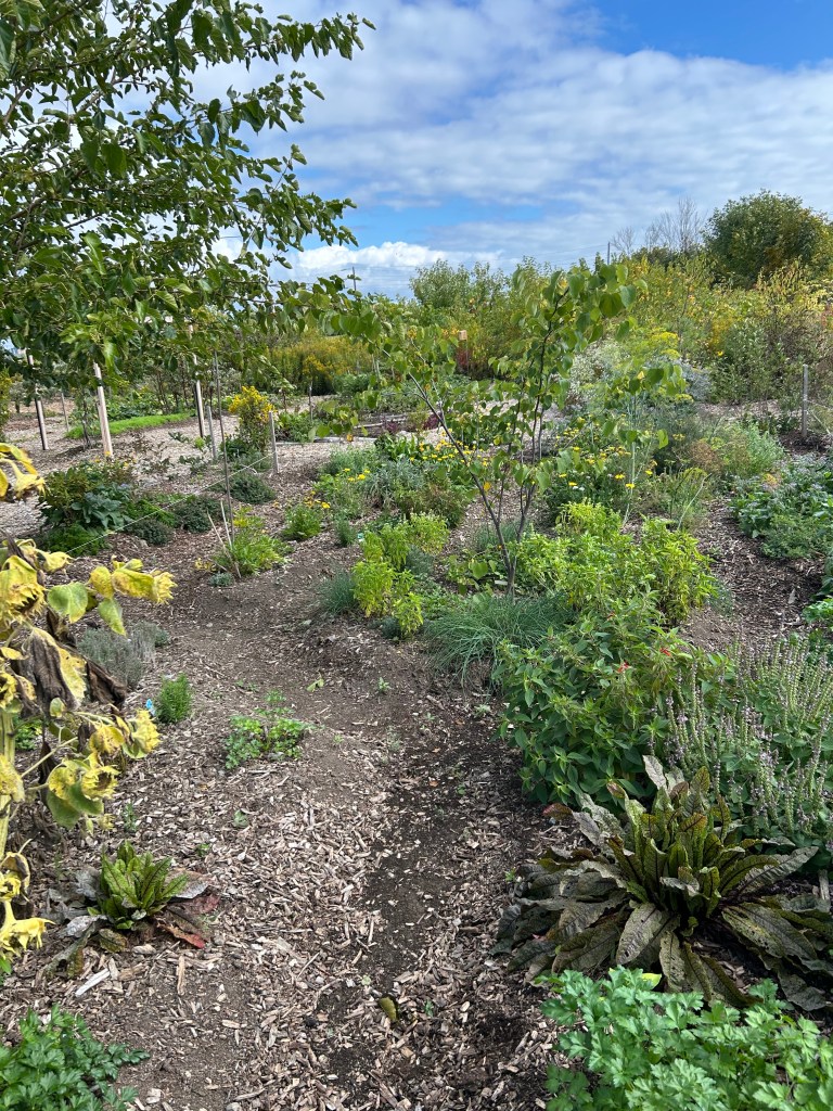 These spaces include the Medicine Garden, the hedgerows of blackberries and raspberries which include lots of other edibles, our Food Forest and Nut Circle, as well as our asparagus patch, planted in 2024, which won’t be ready for harvest for a few years yet. In 2025 we established a communal Herb Garden, and in the fall, planted a shared garlic patch.