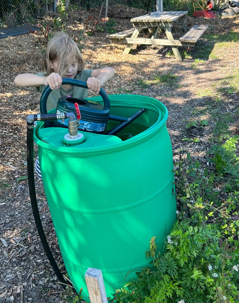 Watering System and Buried Pipes: Lakeside has a number of water barrels, connected to the municipal water supply, and placed at intervals throughout the garden. Watering cans are adjacent to each barrel. Just fill the can as in the photo below, and water your crops, directing the water to the base of each plant.