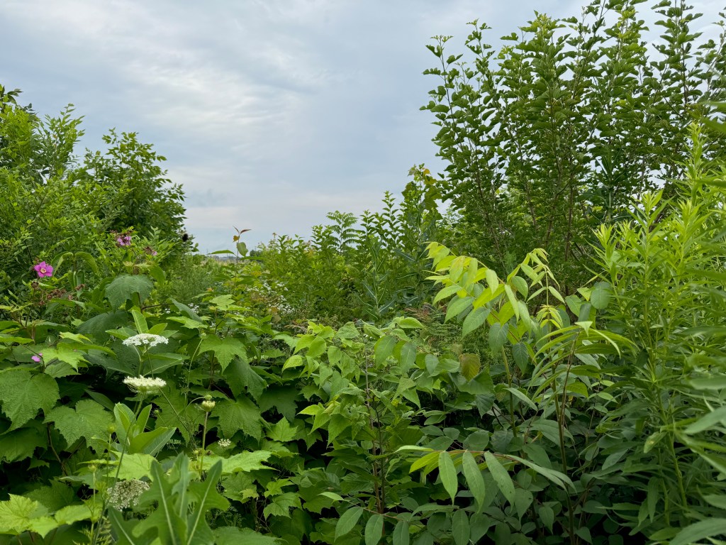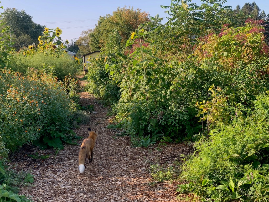 Our permaculture food forest in the northwest corner is a diverse, multi-layer assembly of fruit trees (apple, pear, plum, persimmon, pawpaw, mulberry, peach), nut trees (pecan, butternut), berry bushes (saskatoons, currants, haskaps, gooseberries, blackberries, raspberries, goumi berries, sour cherry) and more interplanted with nitrogen fixing plants (goji berry, wild senna, wild liquorice, new jersey tea, leadplant, canada milk vetch), perennial vegetables (rhubarb, purple fennel, horseradish, asparagus, lovage), herbs (oregano, thyme, chives, garlic chives, anise hyssop), native plants and spontaneous plants (otherwise known as weeds). Permaculture food forest original plan.