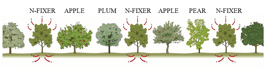 Stefan Sobkowiak’s permaculture orchard, looks to the forest edge and ecological design principles for inspiration. One of his most important design principles is the TRIOS model, planted as polycultures. Each TRIO includes a nitrogen fixer or support species, along with two different fruit or nut trees or cultivars. Ensuring no two trees of the same type are planted next to each other helps ensure good pollination and reduces likelihood of diseases or pests moving between the trees. The nitrogen fixers eliminate the need for fertilization.